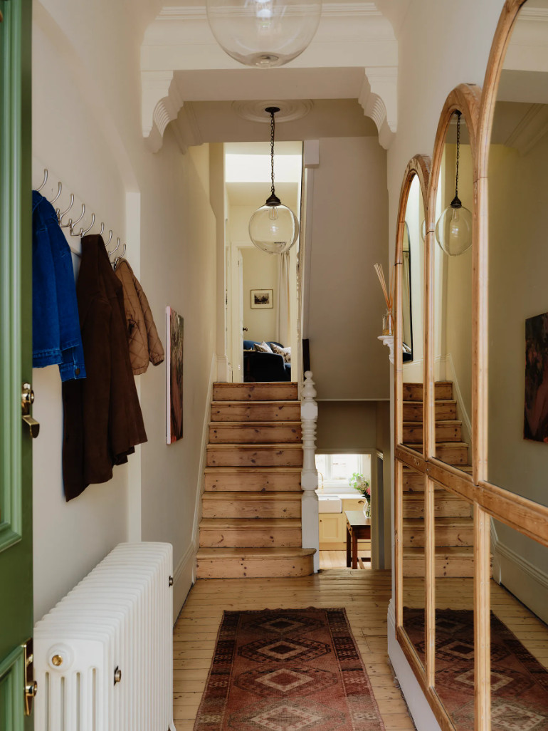 Не забувайте й про візуальні зв’язки: якщо з коридору відкривається вид на інші кімнати, варто підтримати єдину кольорову палітру. Дзеркала допоможуть візуально розширити простір і додати світла, а розсувні або приховані двері дозволять коридору “дихати”, наповнюючи його денним світлом.