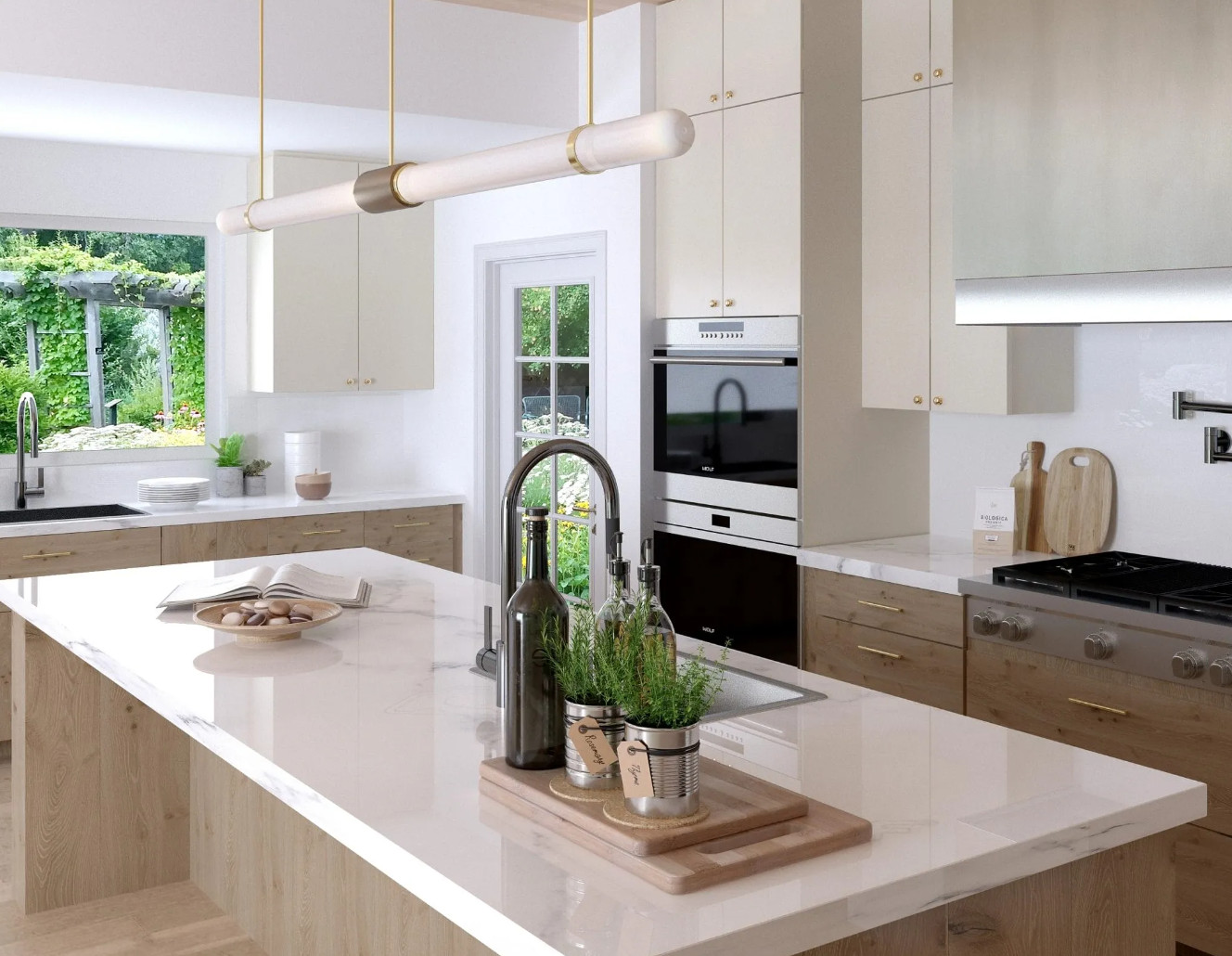 - Використовуйте текстури, щоб уникнути одноманітності: плетені пледи, кам’яні стільниці, керамічні аксесуари чи металеві світильники.