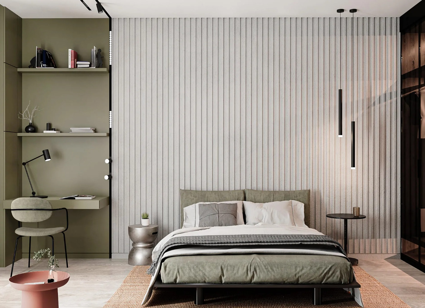 - Для спальні темний тон може стати основою для ліжка або декоративних деталей, створюючи виразний, але затишний акцент.
