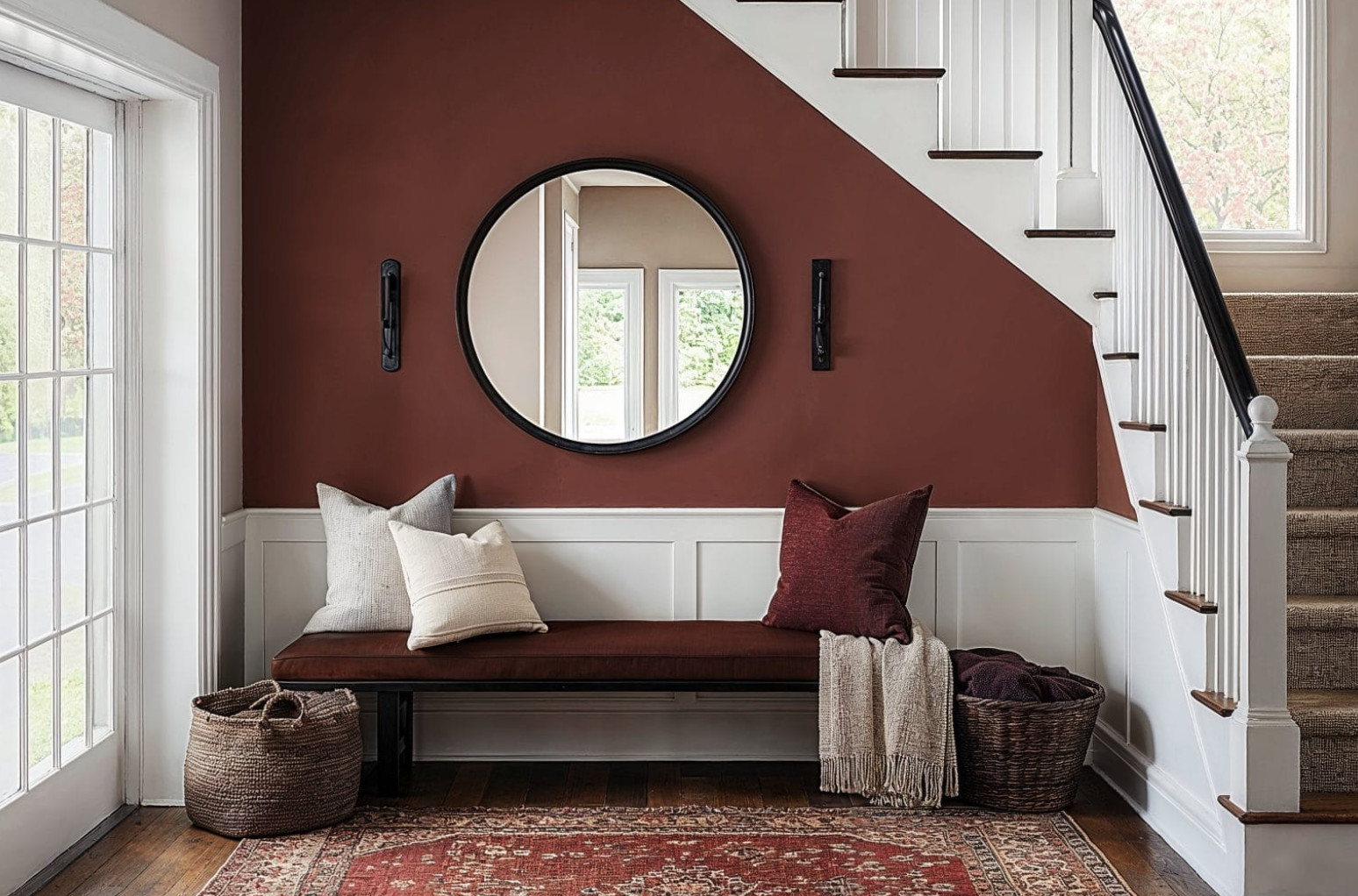 A narrow hallway naturally calls for a runner. Don’t limit yourself to boring, classic options — let the rug become a bold accent. If your walls are light and neutral, choose bright patterns or vintage motifs. Leave about 20 cm of floor space on each side to create a sense of openness.