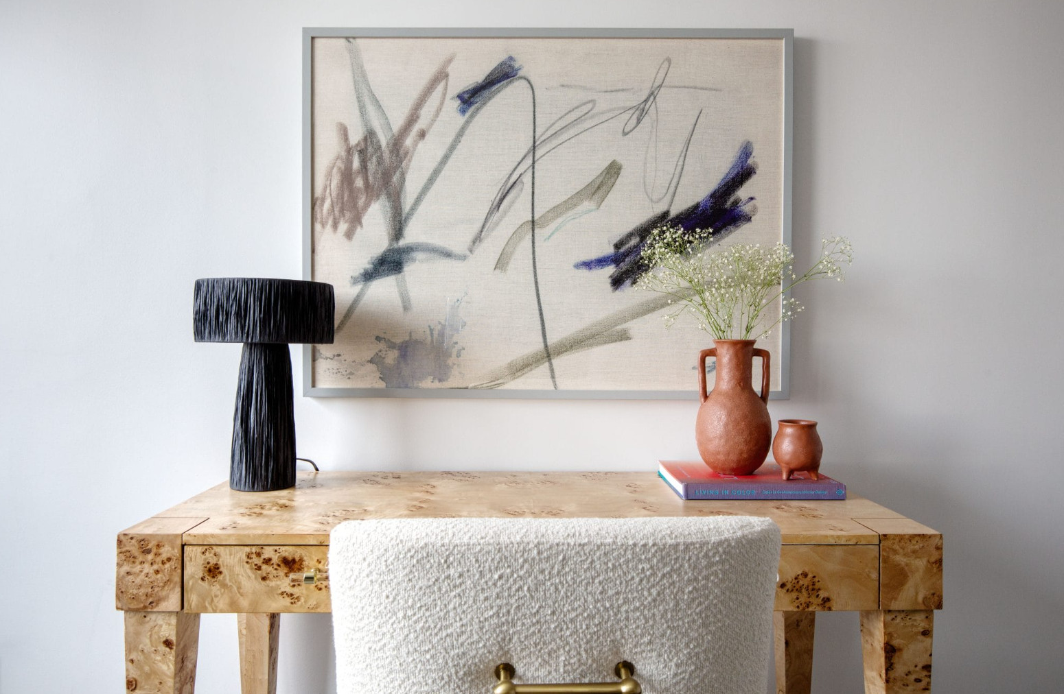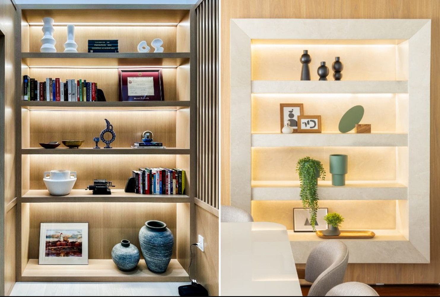 Do you have an awkward niche? Turn it into a decorative feature. Arrange items using a triangular composition: tall item, medium, and low. LED strip lighting will highlight the objects’ beauty, and a small accent lamp will add drama.