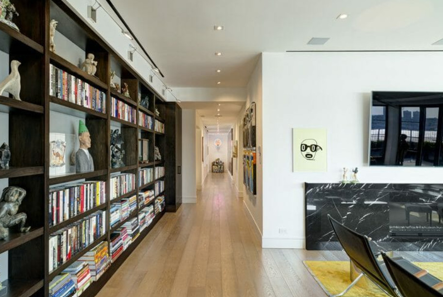 Turn a long hallway into a home library. Avoid making it look like a store — add small plants that tolerate low light, and decorative items on the books, such as ceramics or travel souvenirs. Use the rule of three: group items in odd numbers and vary the heights.