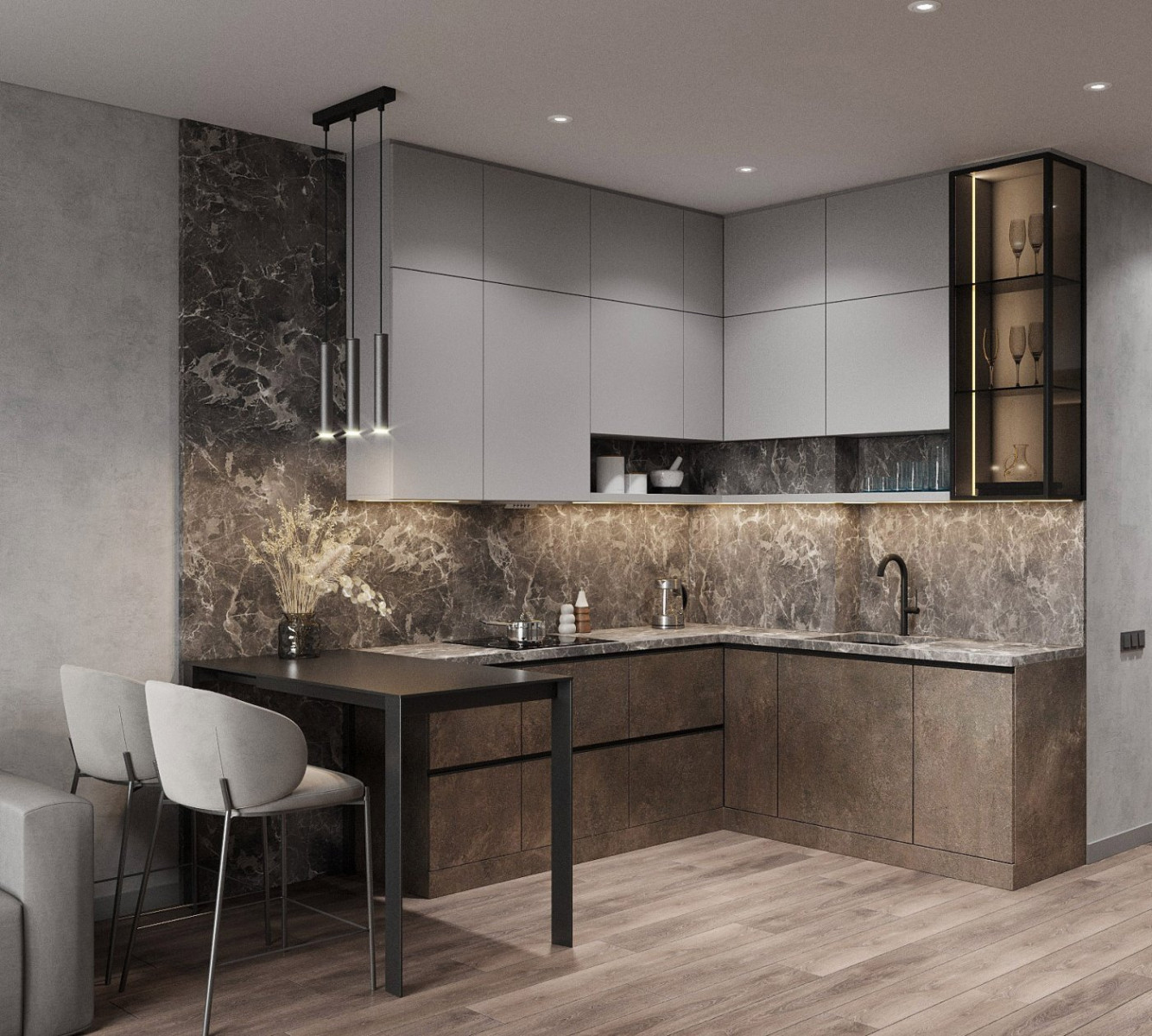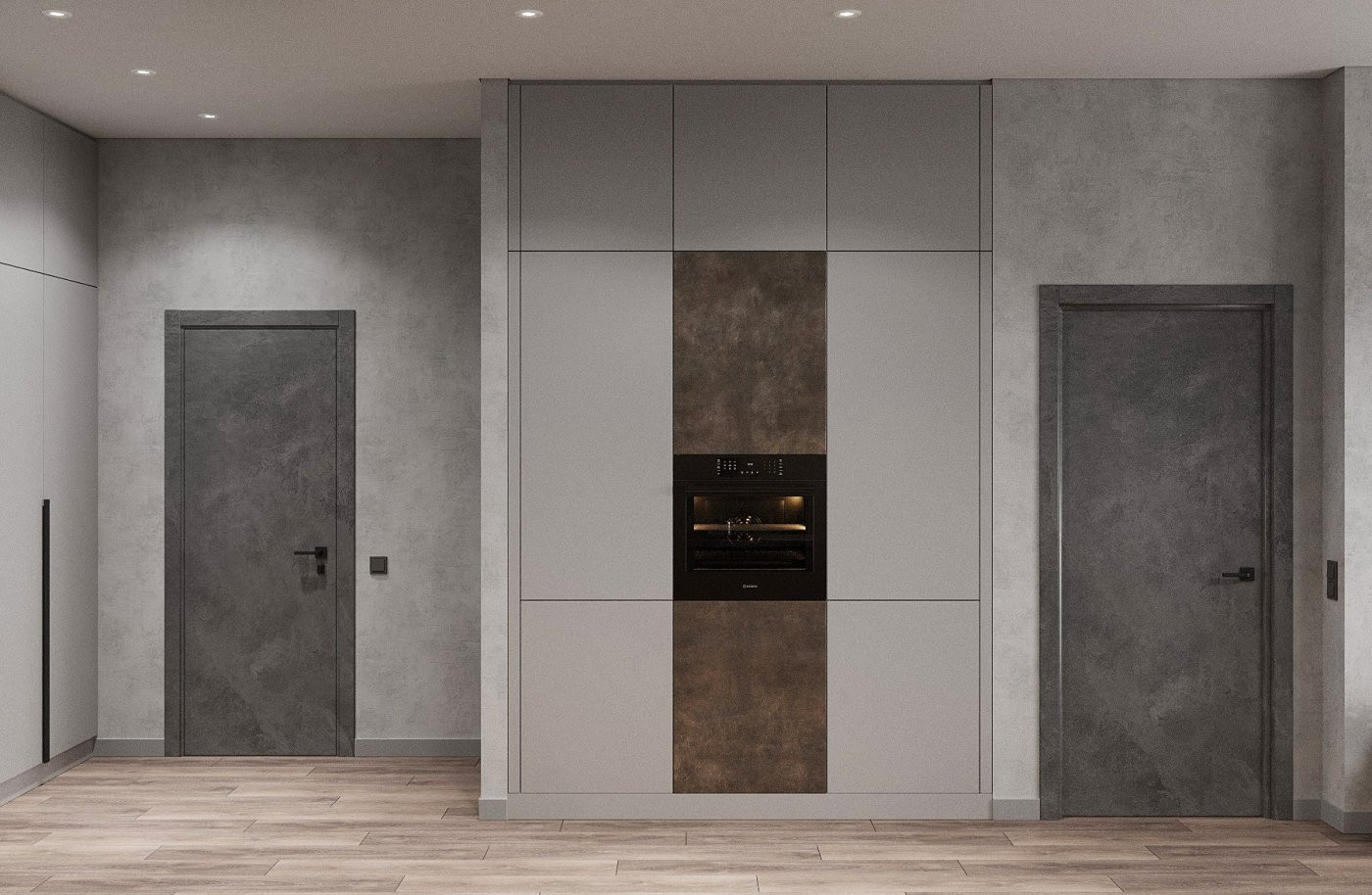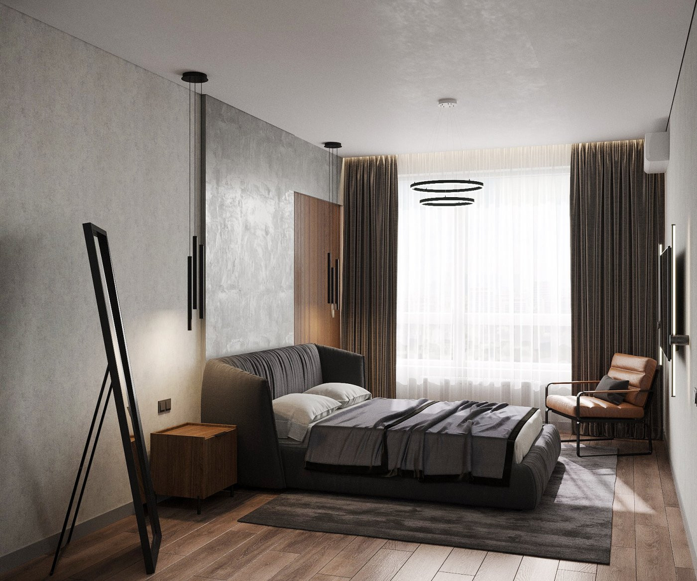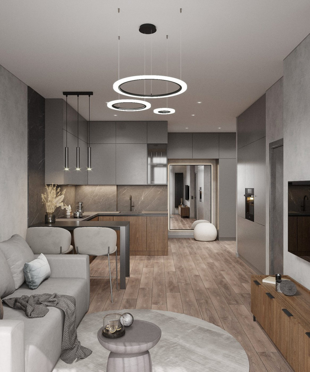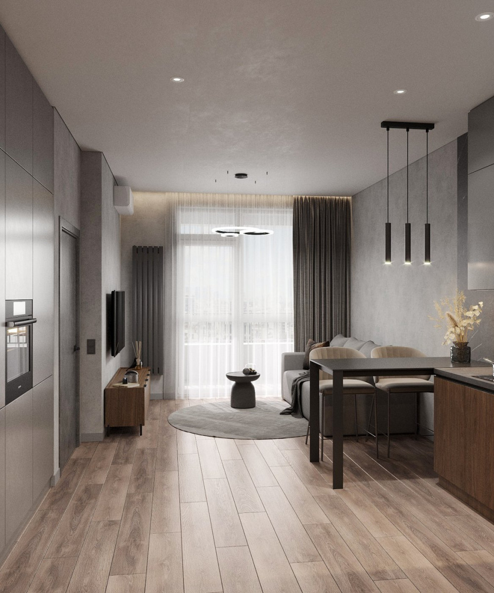 The interior is styled in a modern, minimalist design with elements of soft loft and modern contemporary. The foundation of the composition is a neutral color palette: warm shades of gray, natural wood, matte surfaces, and black accents. This combination gives the space visual cohesion while simultaneously creating a cozy atmosphere.