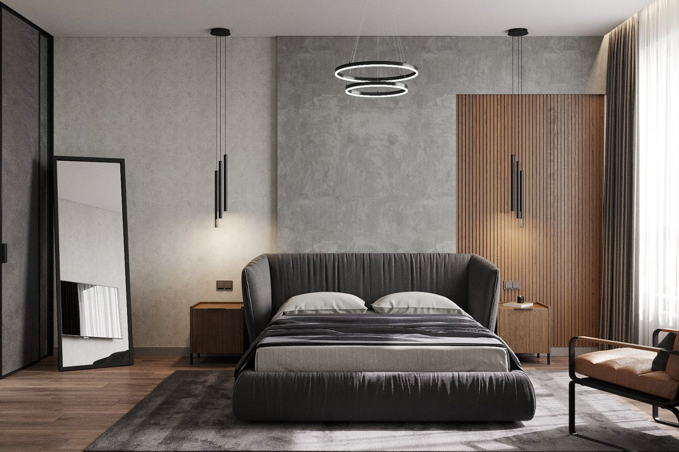 The bedroom is decorated in a calm, warm color scheme. A soft upholstered headboard, wooden panels, and decorative lighting create an intimate, soothing atmosphere. The use of textiles and diffused ambient lighting makes the space conducive to rest and rejuvenation.