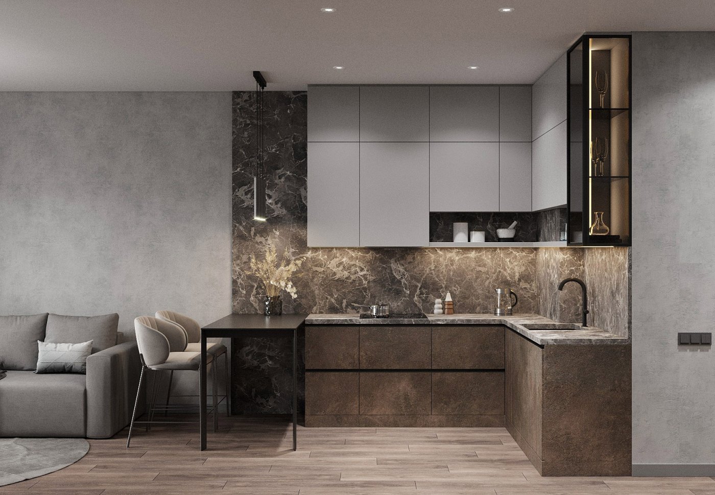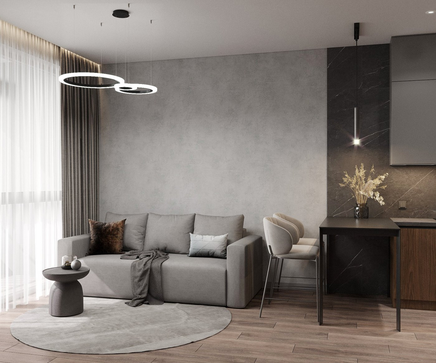 The apartment layout has been thoughtfully planned: the kitchen is integrated with the living room, allowing for maximum use of the space and better natural lighting. The bedroom is a separate zone, yet thanks to the light color scheme and carefully designed lighting, it maintains a sense of spaciousness. Each area has a clearly defined function without the need for unnecessary partitions.