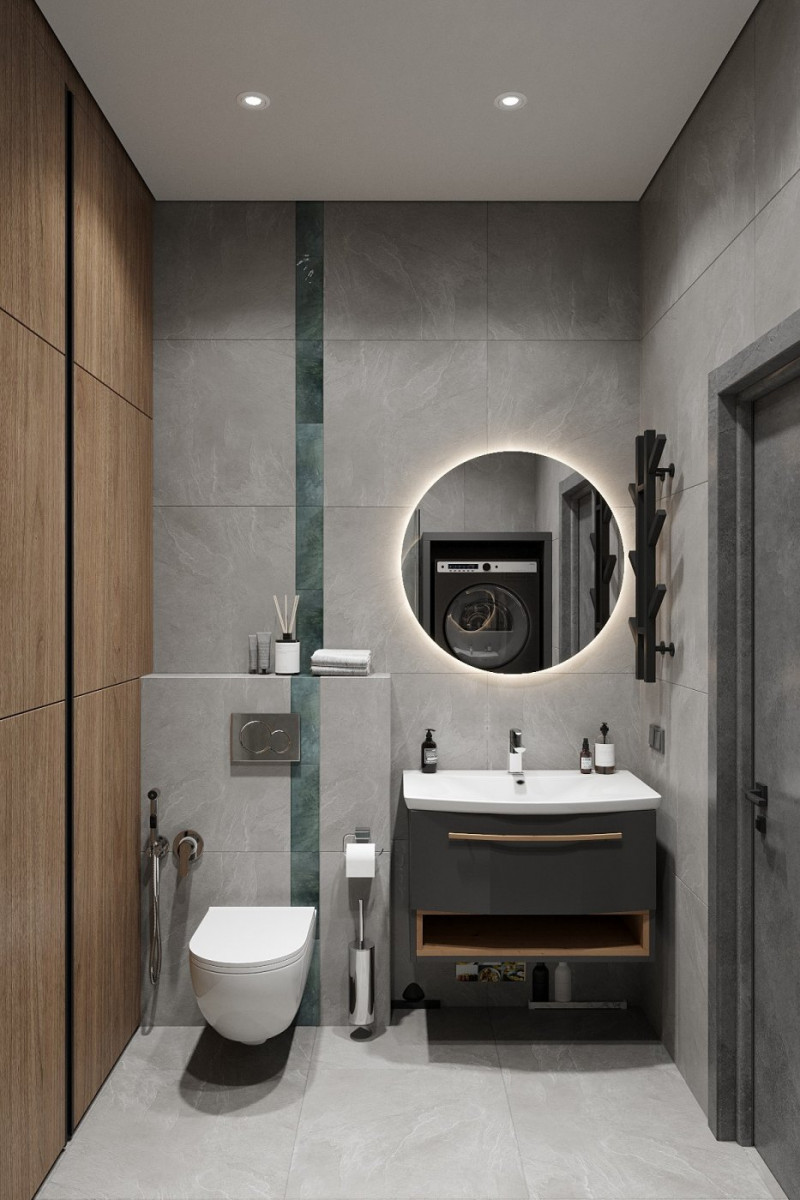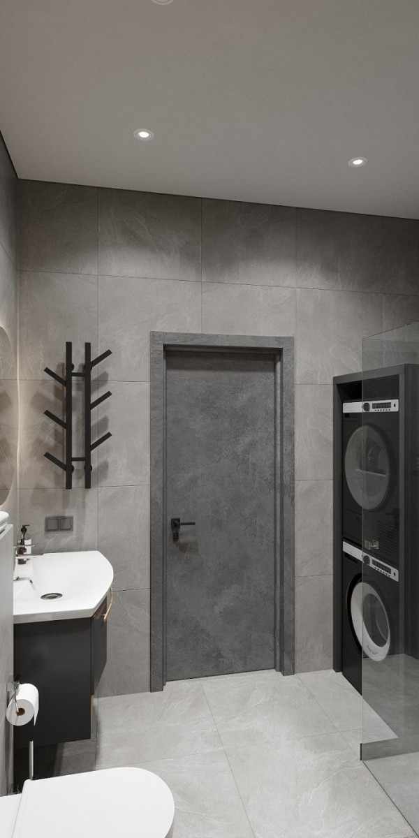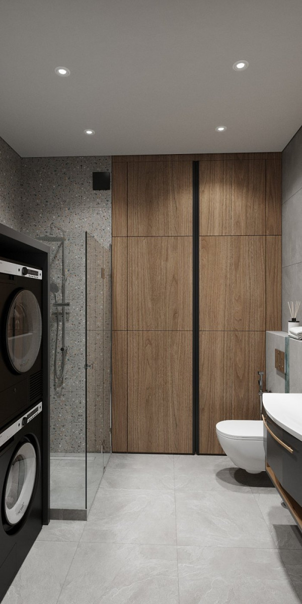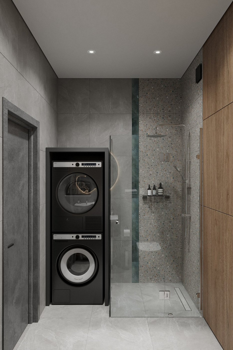 The bathroom is designed in a modern style using porcelain tiles, concrete textures, and wood. Thoughtful placement of the washer and dryer in a built-in niche preserves the visual cleanliness of the interior without compromising functionality. A glass shower enclosure visually expands the space and gives it a sense of lightness.