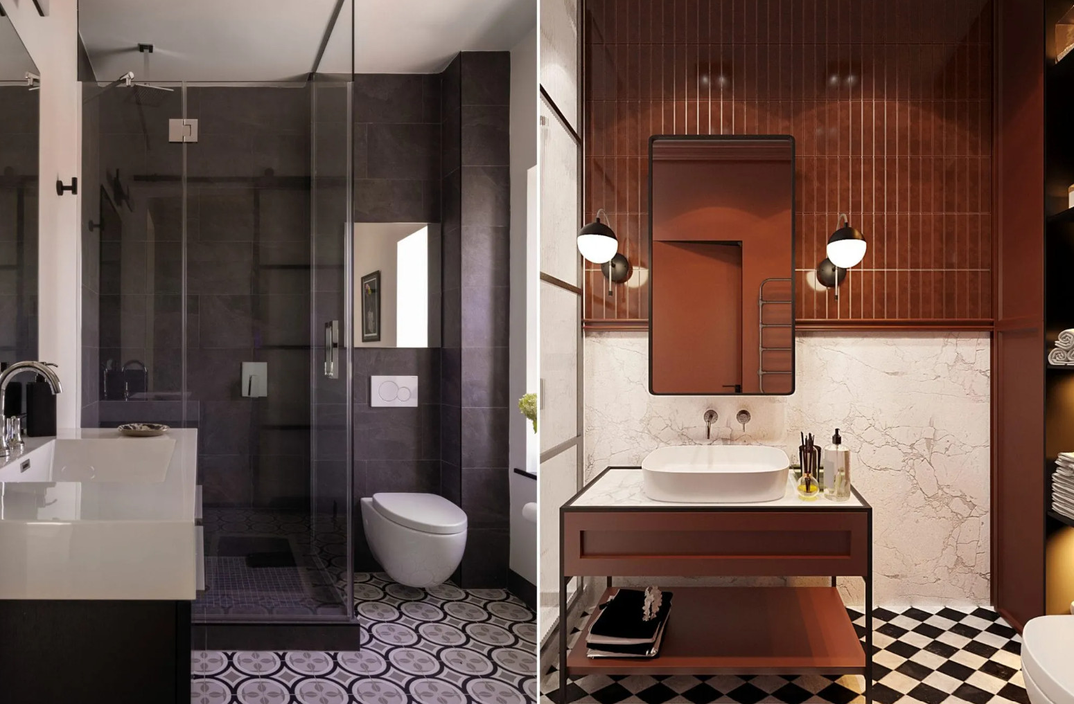Combining two tiles in contrasting shades helps define zones and adds visual interest. For example, a calm tile paired with a bold or patterned one creates an accent area.