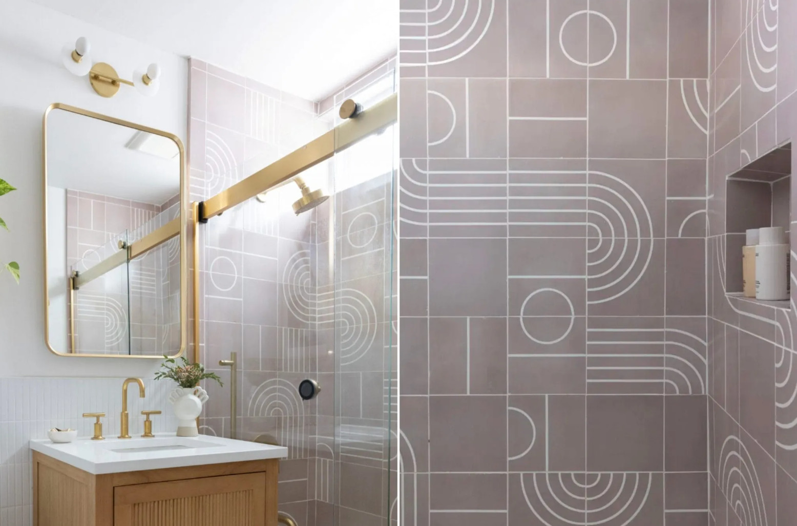 Graphic tiles turn the shower into a striking centerpiece. Contrasting shapes and lines energize the space while maintaining a clean, modern aesthetic.