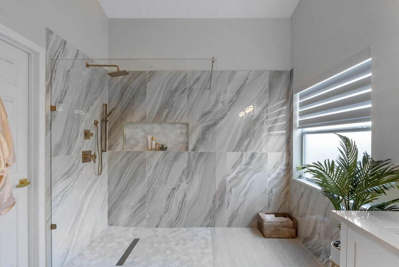 Built-in niches for toiletries become design features. Small mosaics with metallic accents or marble details look like jewelry, especially when paired with LED lighting.