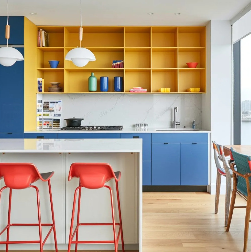 The kitchen is an ideal place for this color. A backsplash in muted yellow tiles or painting the interiors of open shelves adds warmth without overwhelming the space.