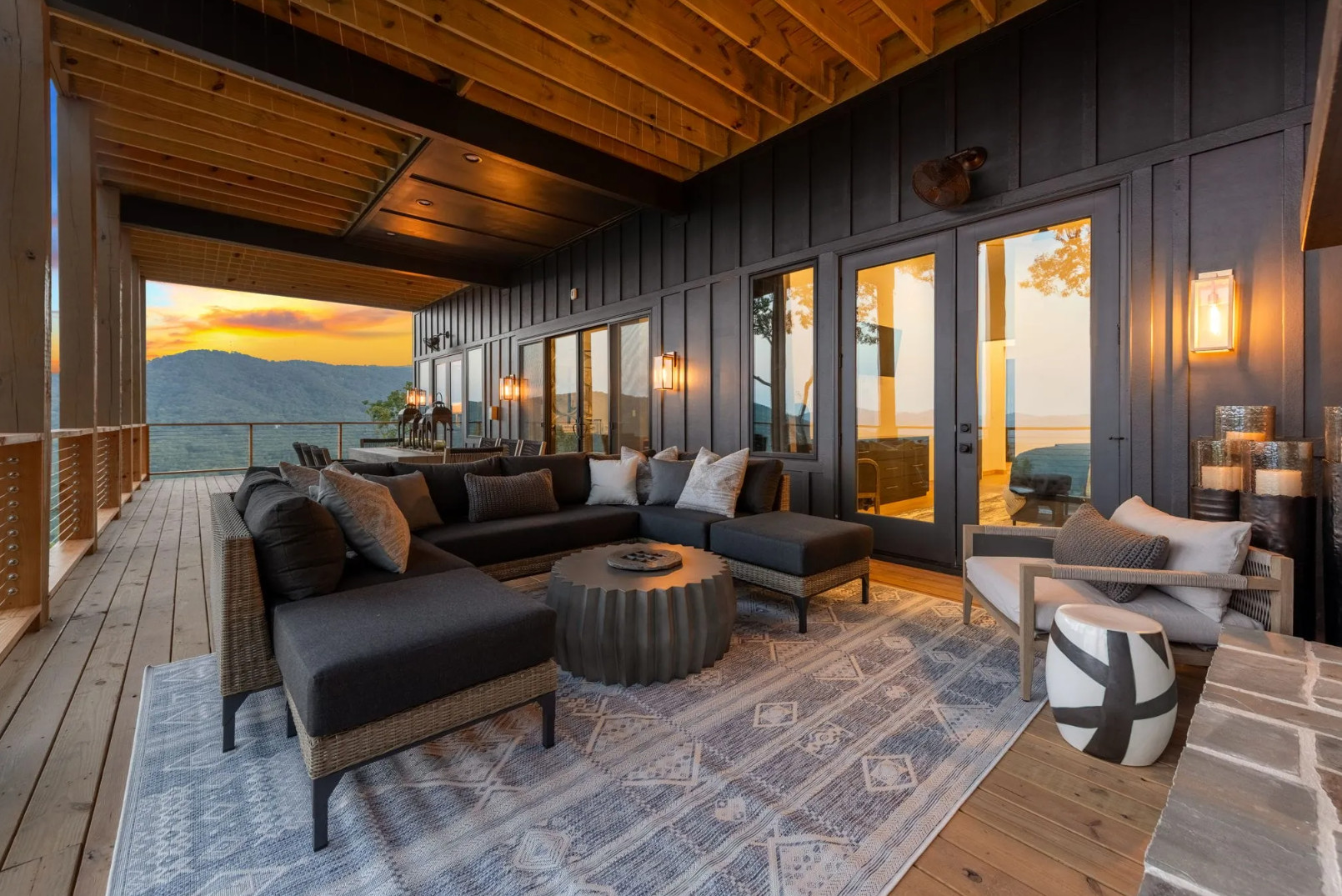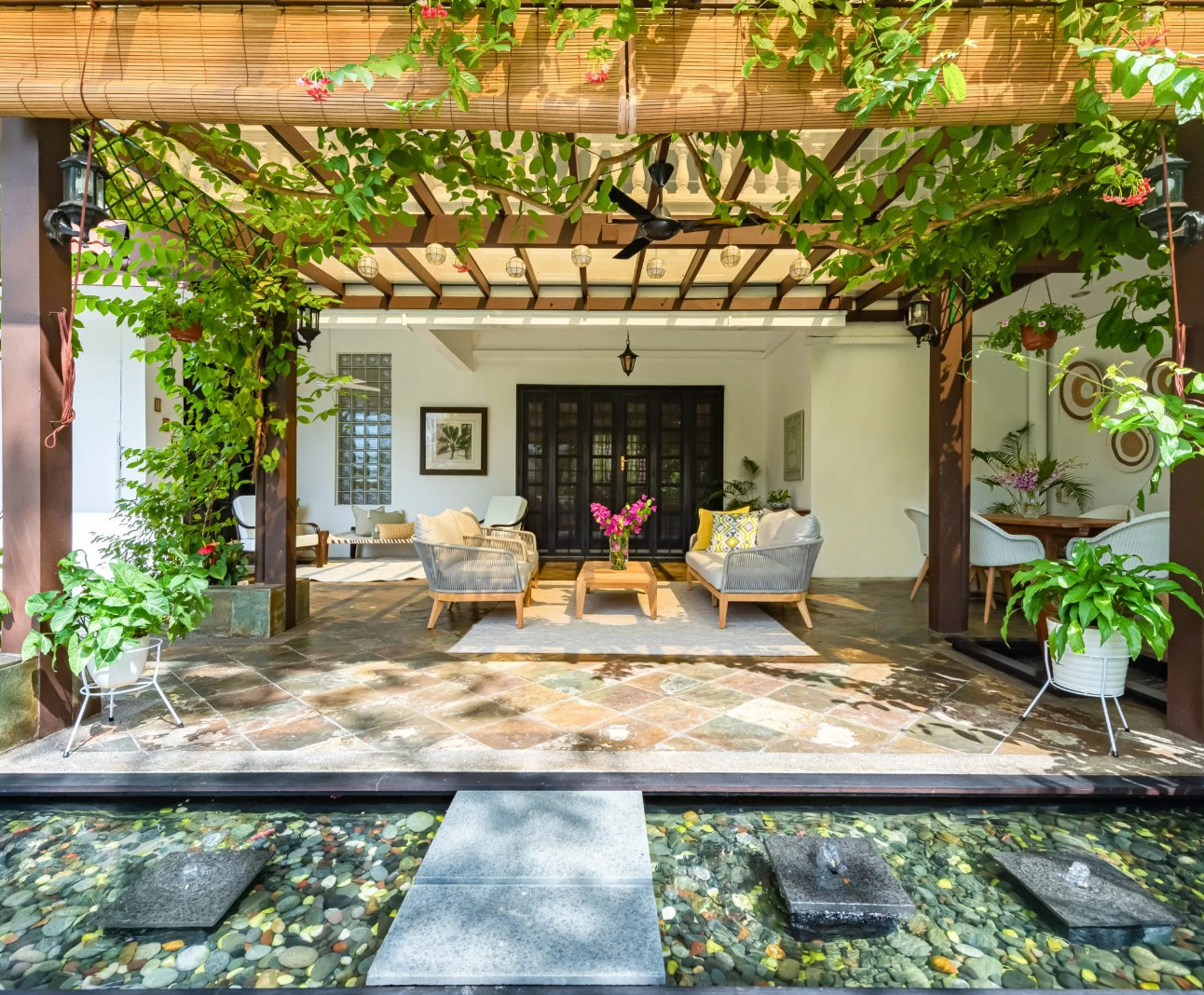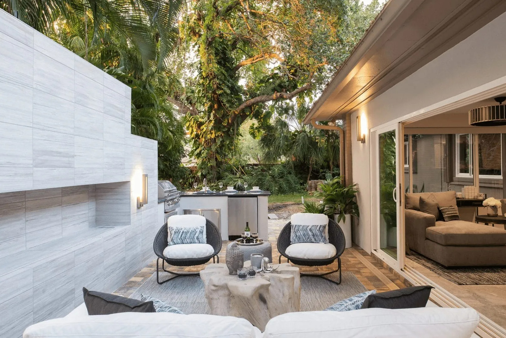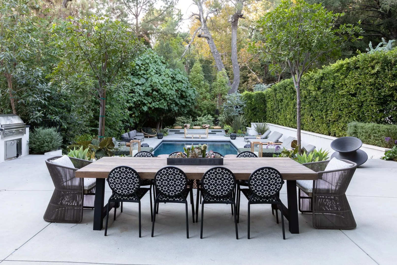 Granica między domem a patio staje się niemal niewidoczna. Podłogi, meble i oświetlenie kontynuują linie wnętrza, dzięki czemu wyjście na zewnątrz nie jest już przejściem, a jedynie zmianą atmosfery.