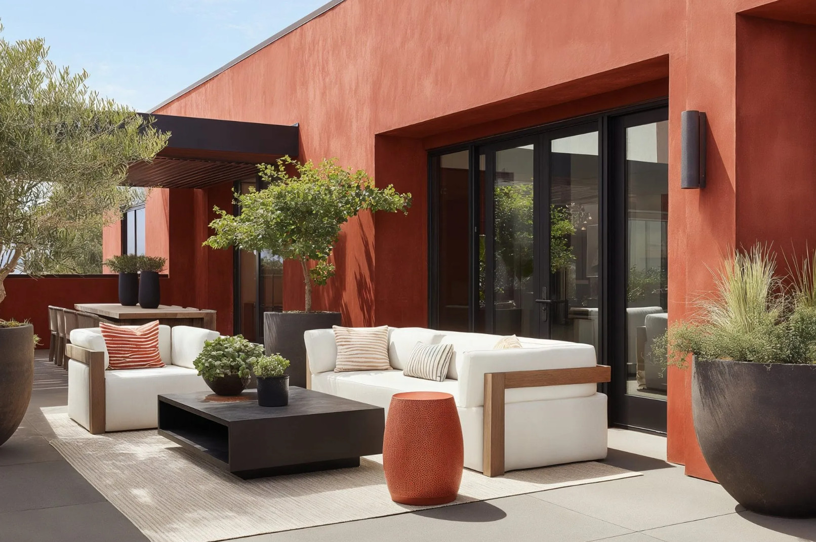 Świat patio nabiera barw. Zamiast klasycznego beżu pojawiają się intensywne odcienie: glina, szałwia, ochra, bordo i ciemna oliwka. Ściany, ławki, a nawet posadzki pokrywane są lakierami, które lśnią w słońcu. Połączenie błyszczących i matowych tekstur tworzy subtelną grę światła i głębi.