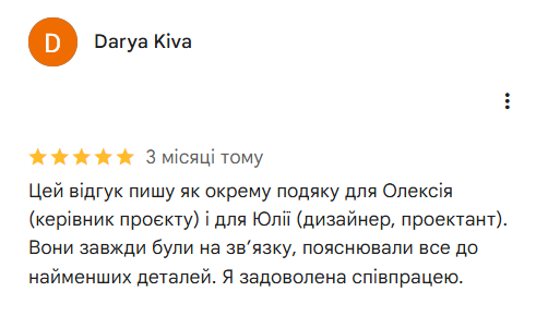 Цей відгук пишу як окрему подяку для Олексія (керівник проєкту) і для Юлії (дизайнер, проектант). Вони завжди були на звʼязку, пояснювали все до найменших деталей. Я задоволена співпрацею.