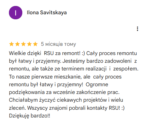 Велике спасибі RSU за ремонт! :) Весь процес ремонту пройшов легко та приємно. Ми дуже задоволені не тільки самим ремонтом, а й термінами виконання та командою. Це наша перша квартира, але весь процес ремонту пройшов легко та приємно!