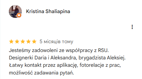 Ми задоволені співпрацею з RSU. Дизайнерки Дарія та Олександра, бригадир Олексій. Легкий зв’язок через додаток, фотозвіти з робіт, можливість ставити запитання.