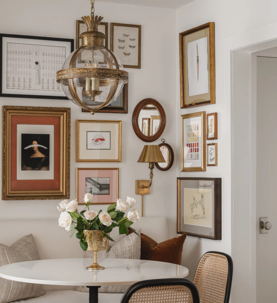 Создайте галерею из рамок разной формы и размера или расставьте акценты на полках. Главное, чтобы композиция выглядела продуманной, но непринуждённой.