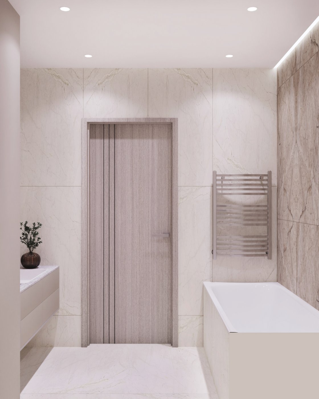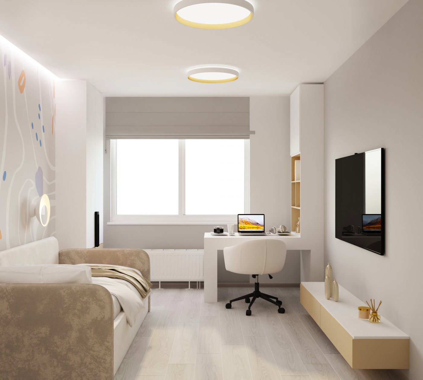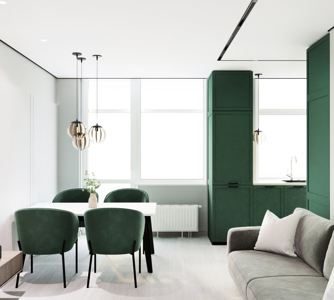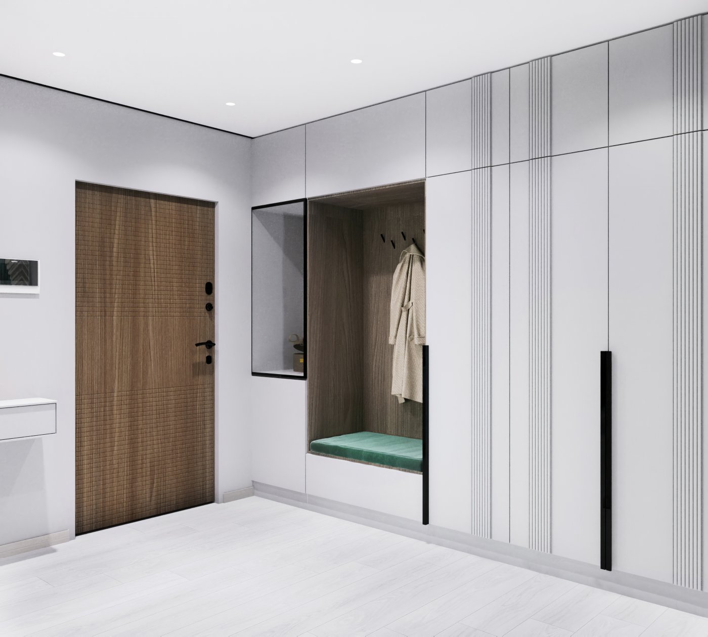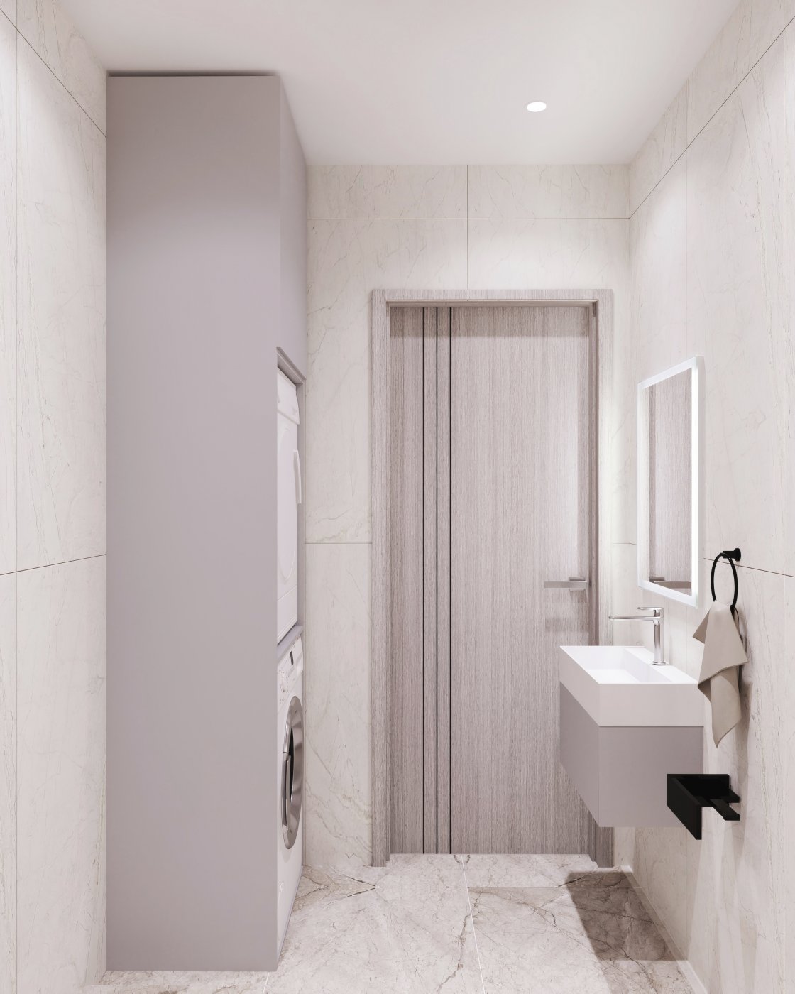 Интерьер двухкомнатной квартиры выполнен в современном стиле с использованием светлой палитры и натуральных материалов, что создаёт ощущение простора и уюта. Кухня оснащена встроенной техникой и гармонично объединена с обеденной зоной, обеспечивая комфорт и удобство. Спальня оформлена в минималистичном стиле с продуманными решениями для хранения, что делает пространство максимально функциональным.
