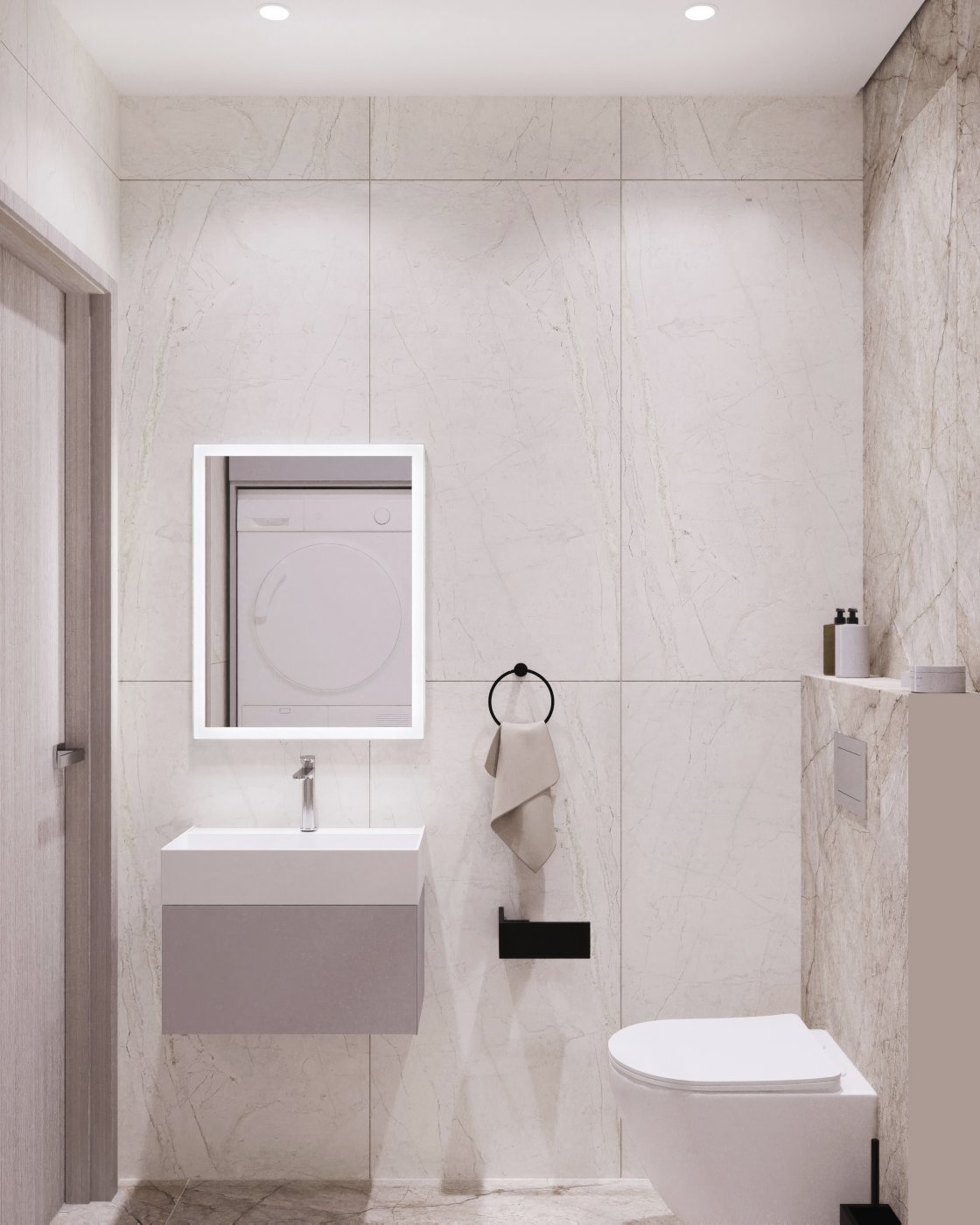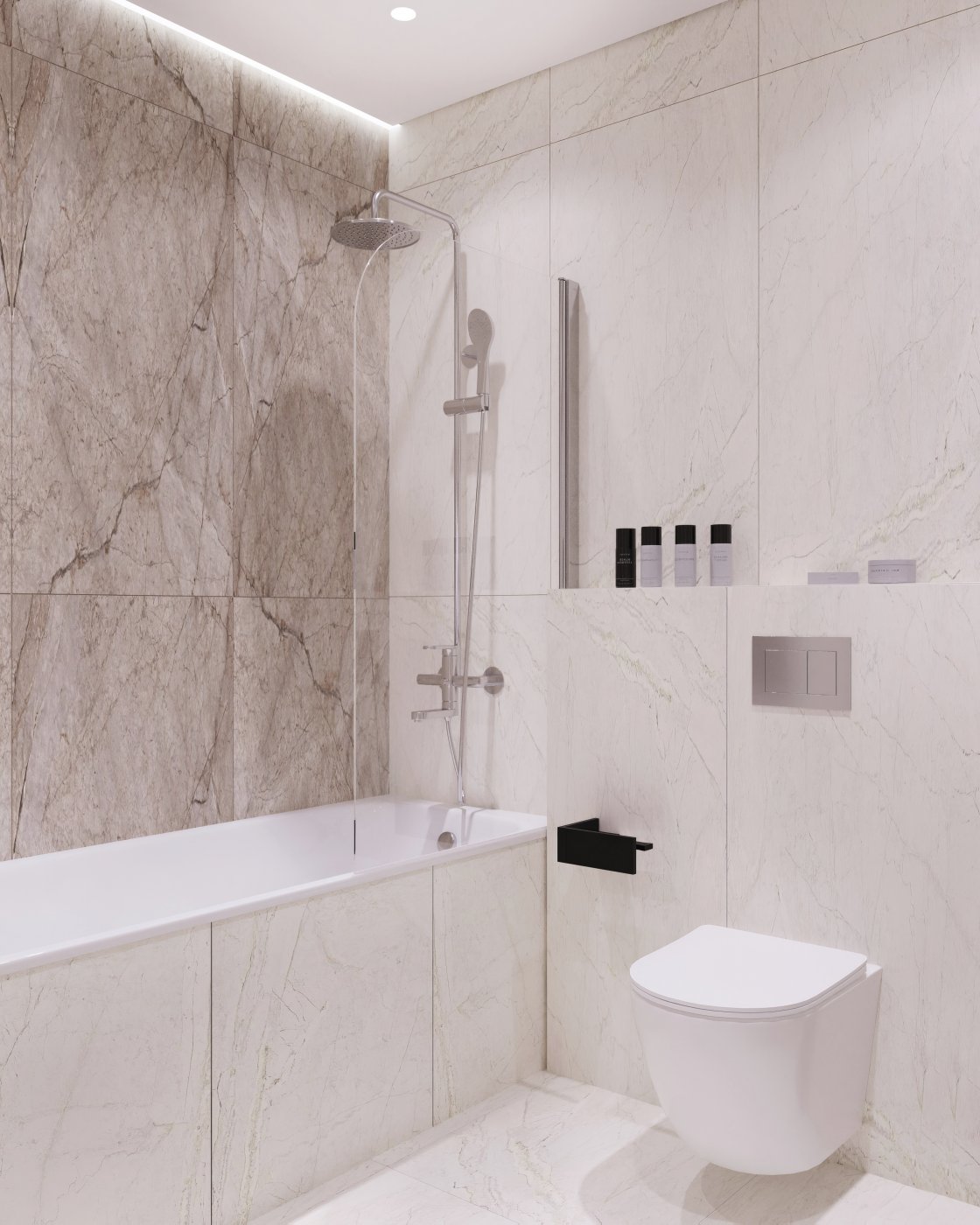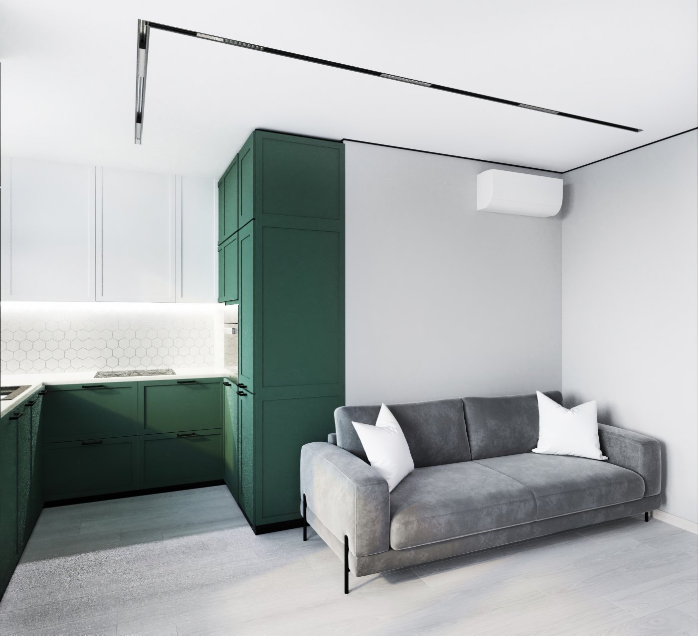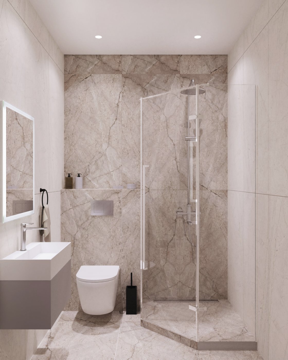 Интерьер двухкомнатной квартиры выполнен в современном стиле с использованием светлой палитры и натуральных материалов, что создаёт ощущение простора и уюта. Кухня оснащена встроенной техникой и гармонично объединена с обеденной зоной, обеспечивая комфорт и удобство. Спальня оформлена в минималистичном стиле с продуманными решениями для хранения, что делает пространство максимально функциональным.