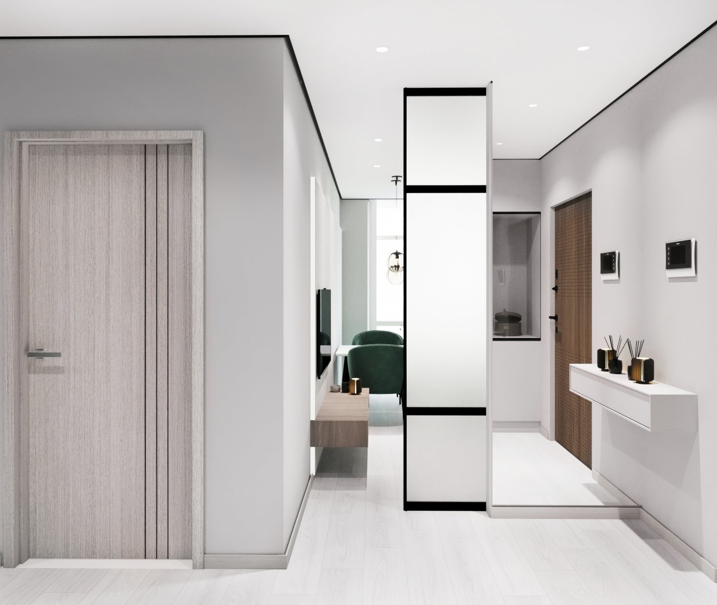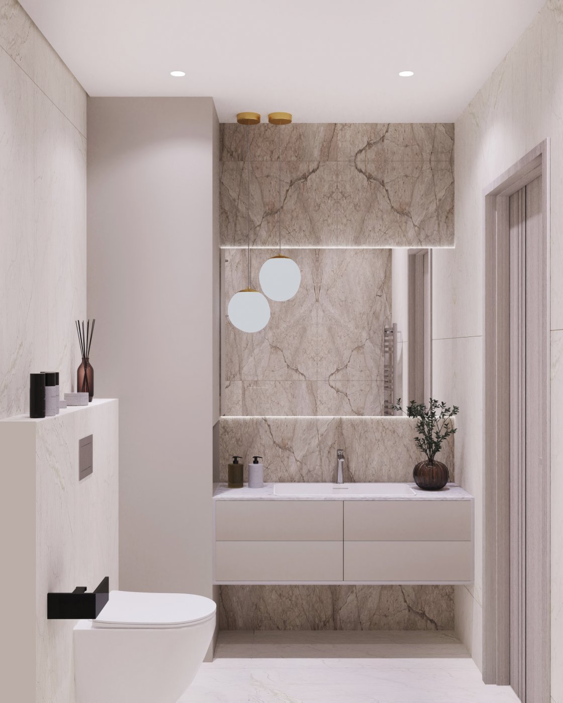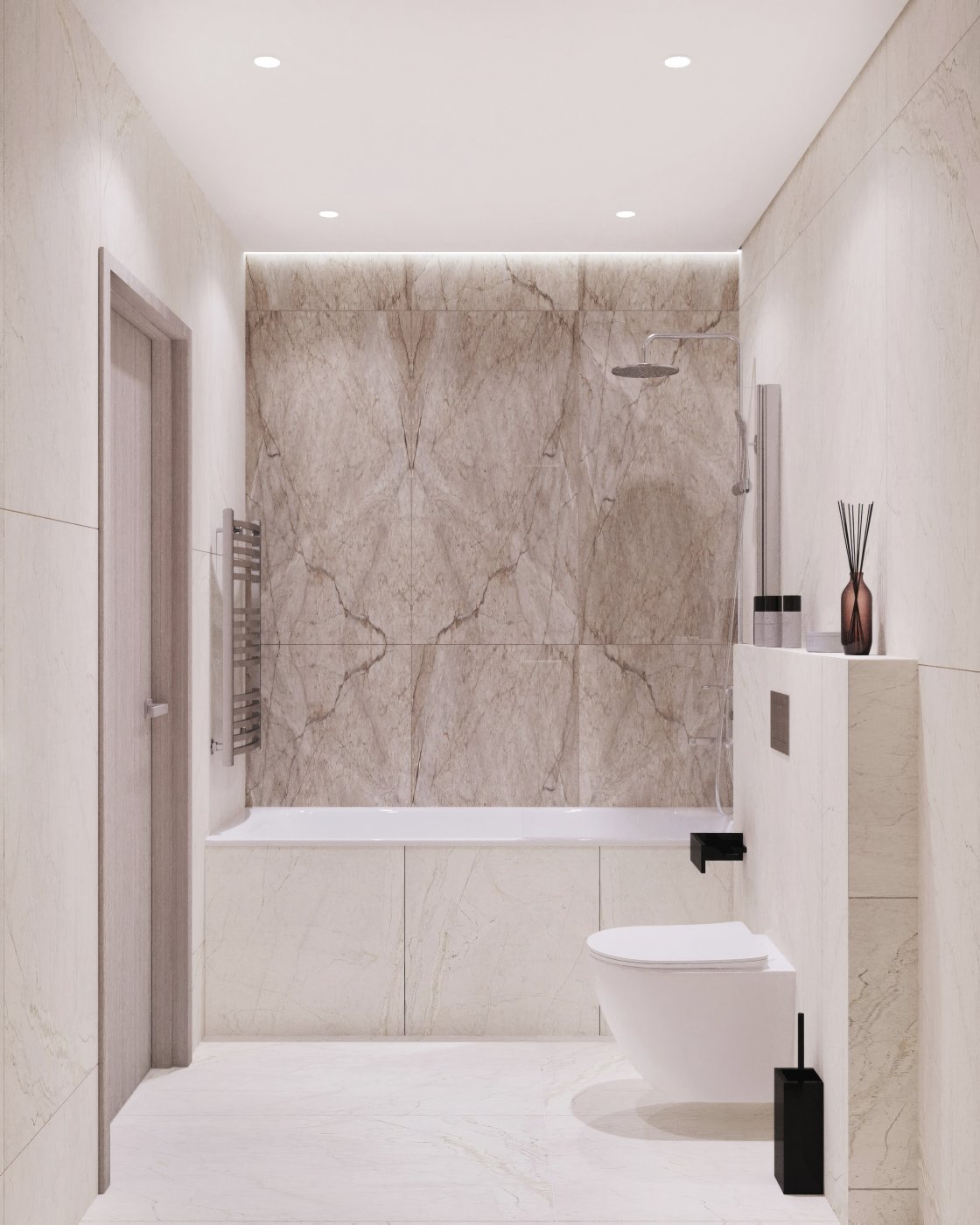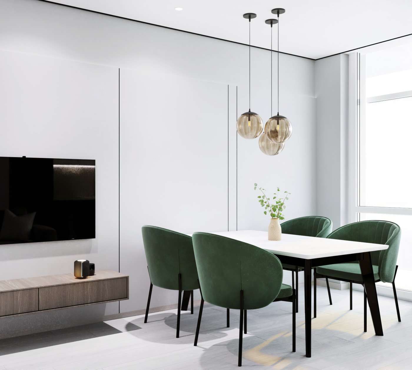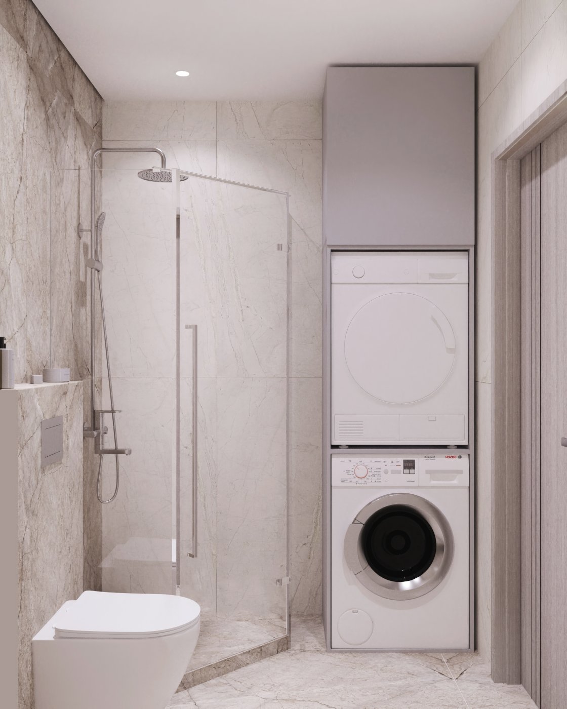 Интерьер двухкомнатной квартиры выполнен в современном стиле с использованием светлой палитры и натуральных материалов, что создаёт ощущение простора и уюта. Кухня оснащена встроенной техникой и гармонично объединена с обеденной зоной, обеспечивая комфорт и удобство. Спальня оформлена в минималистичном стиле с продуманными решениями для хранения, что делает пространство максимально функциональным.