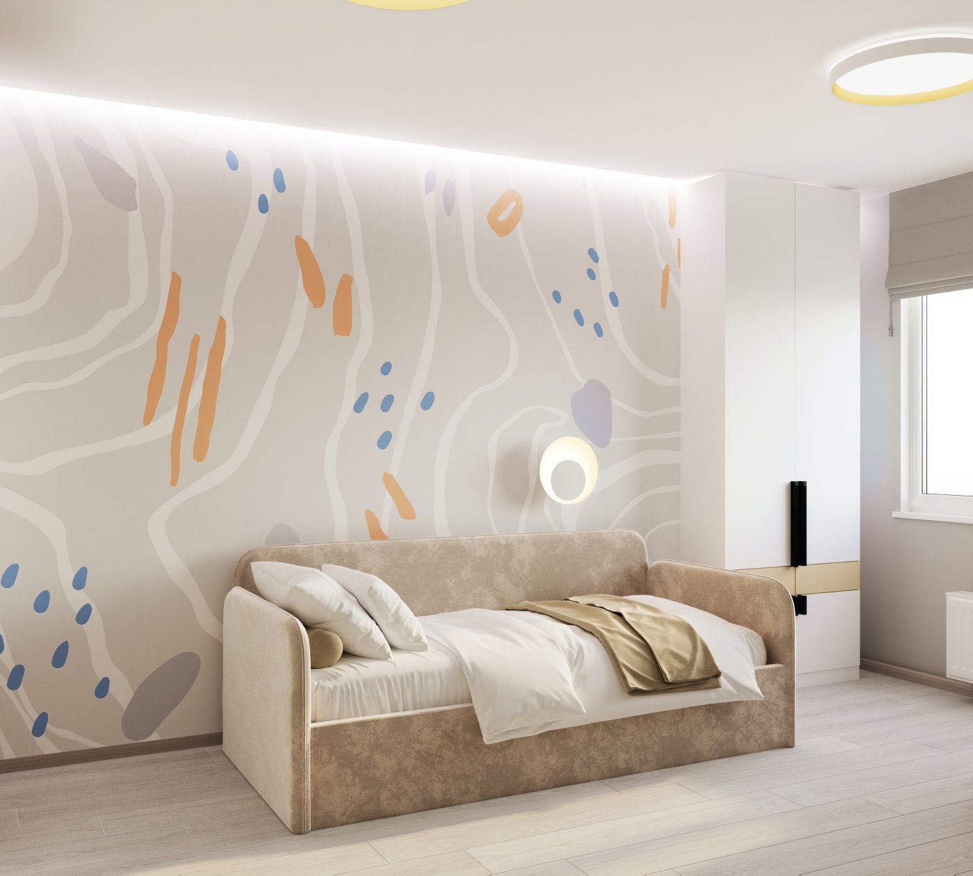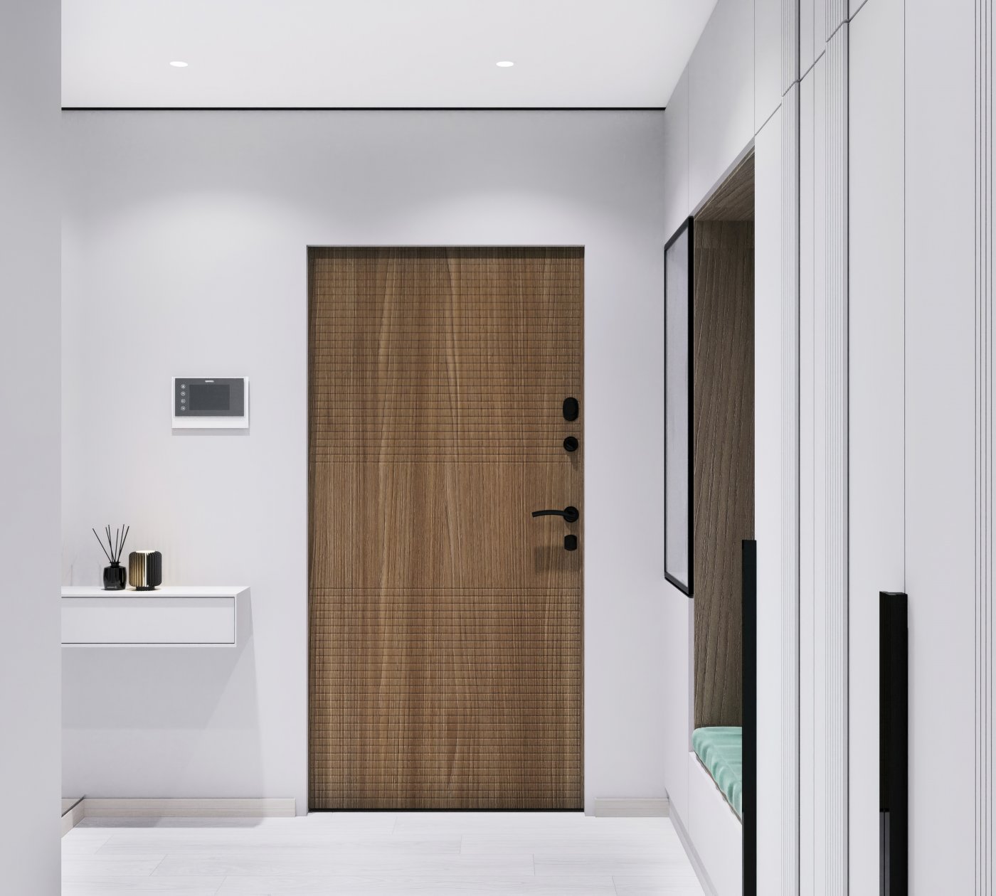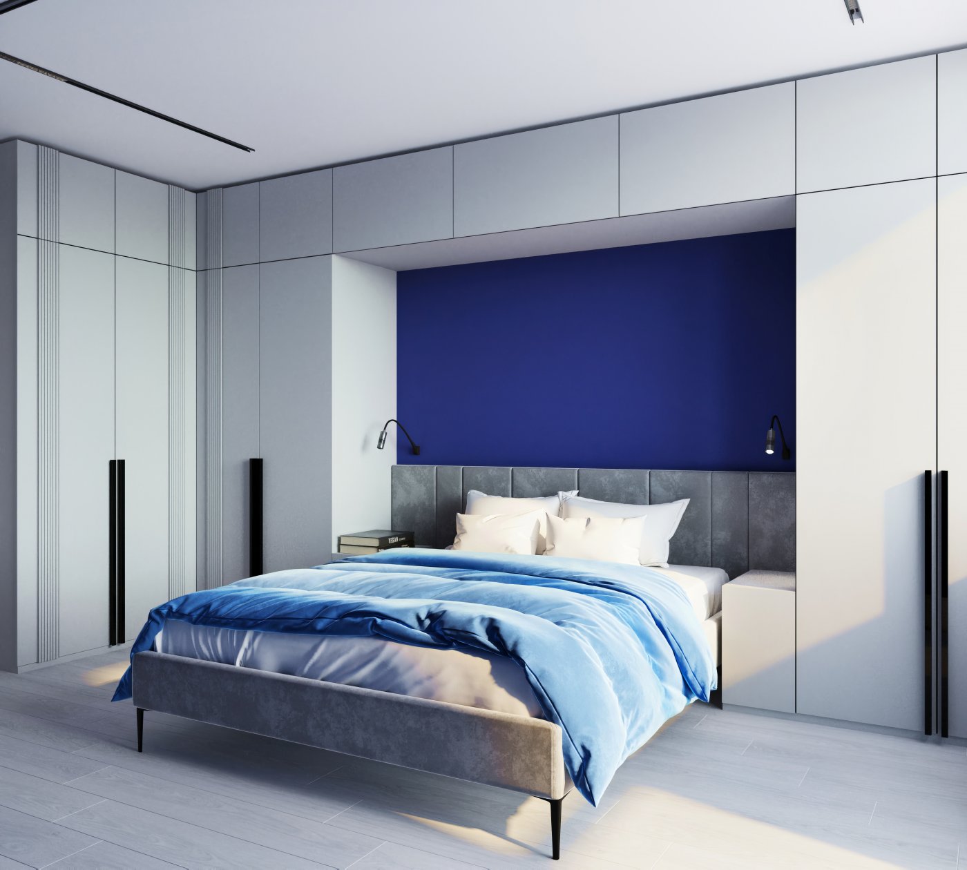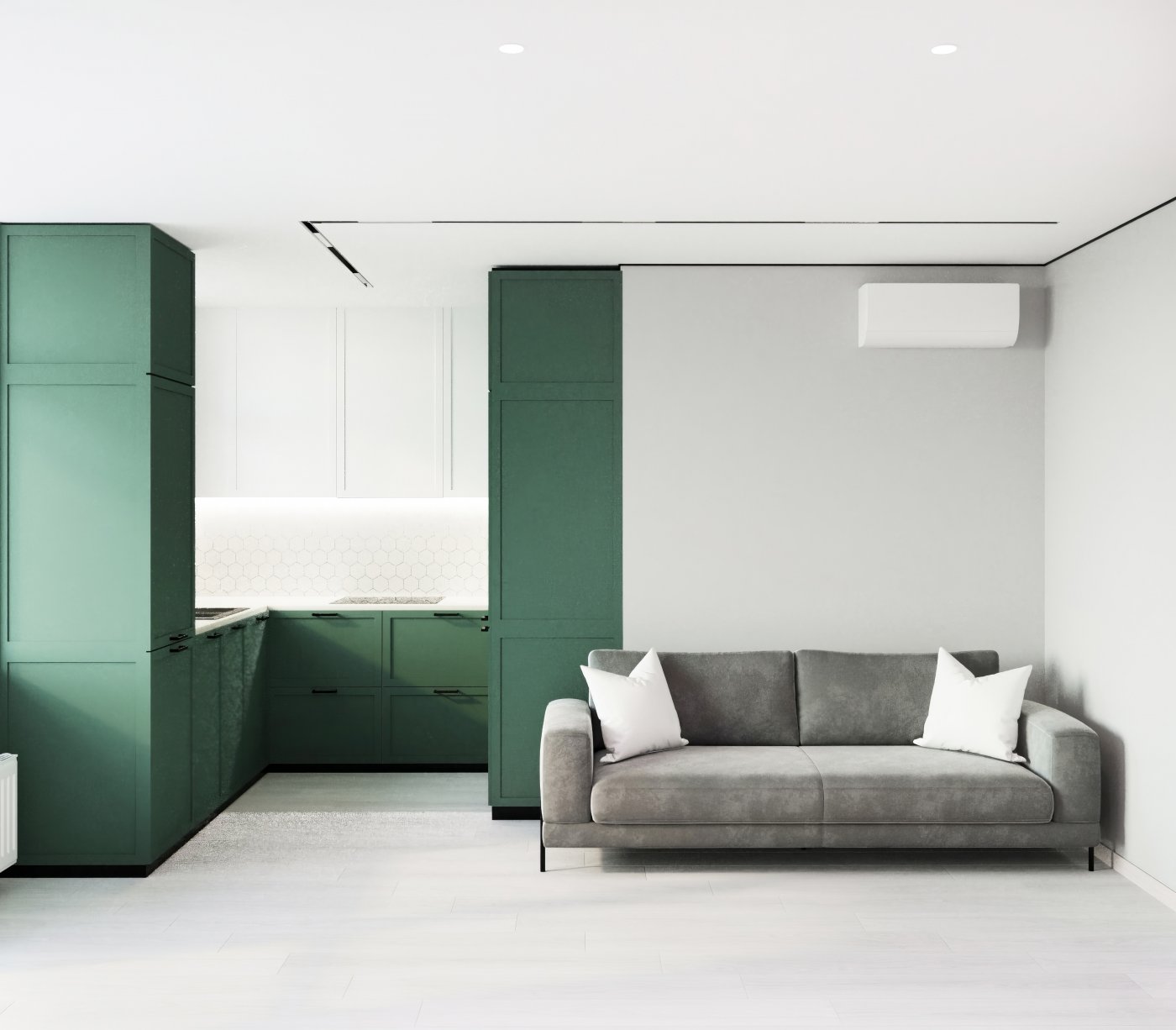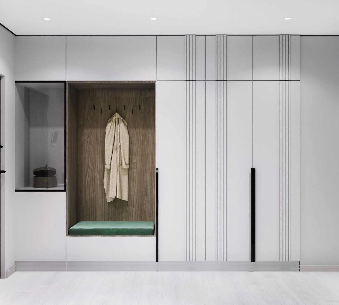 Интерьер двухкомнатной квартиры выполнен в современном стиле с использованием светлой палитры и натуральных материалов, что создаёт ощущение простора и уюта. Кухня оснащена встроенной техникой и гармонично объединена с обеденной зоной, обеспечивая комфорт и удобство. Спальня оформлена в минималистичном стиле с продуманными решениями для хранения, что делает пространство максимально функциональным.