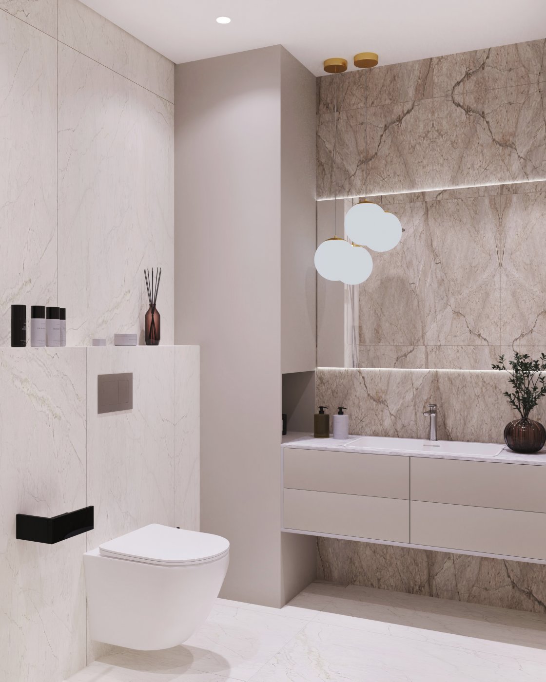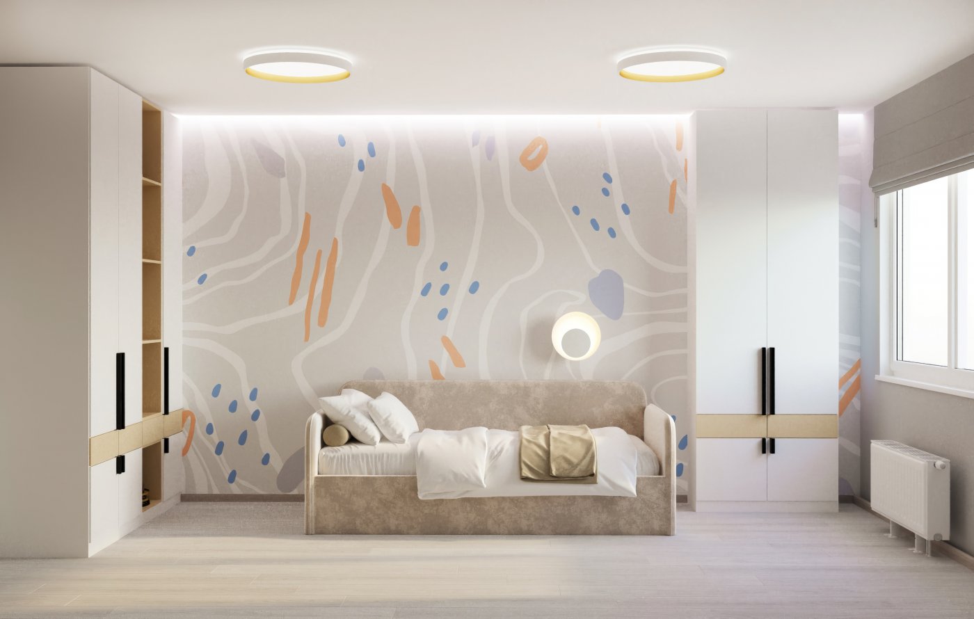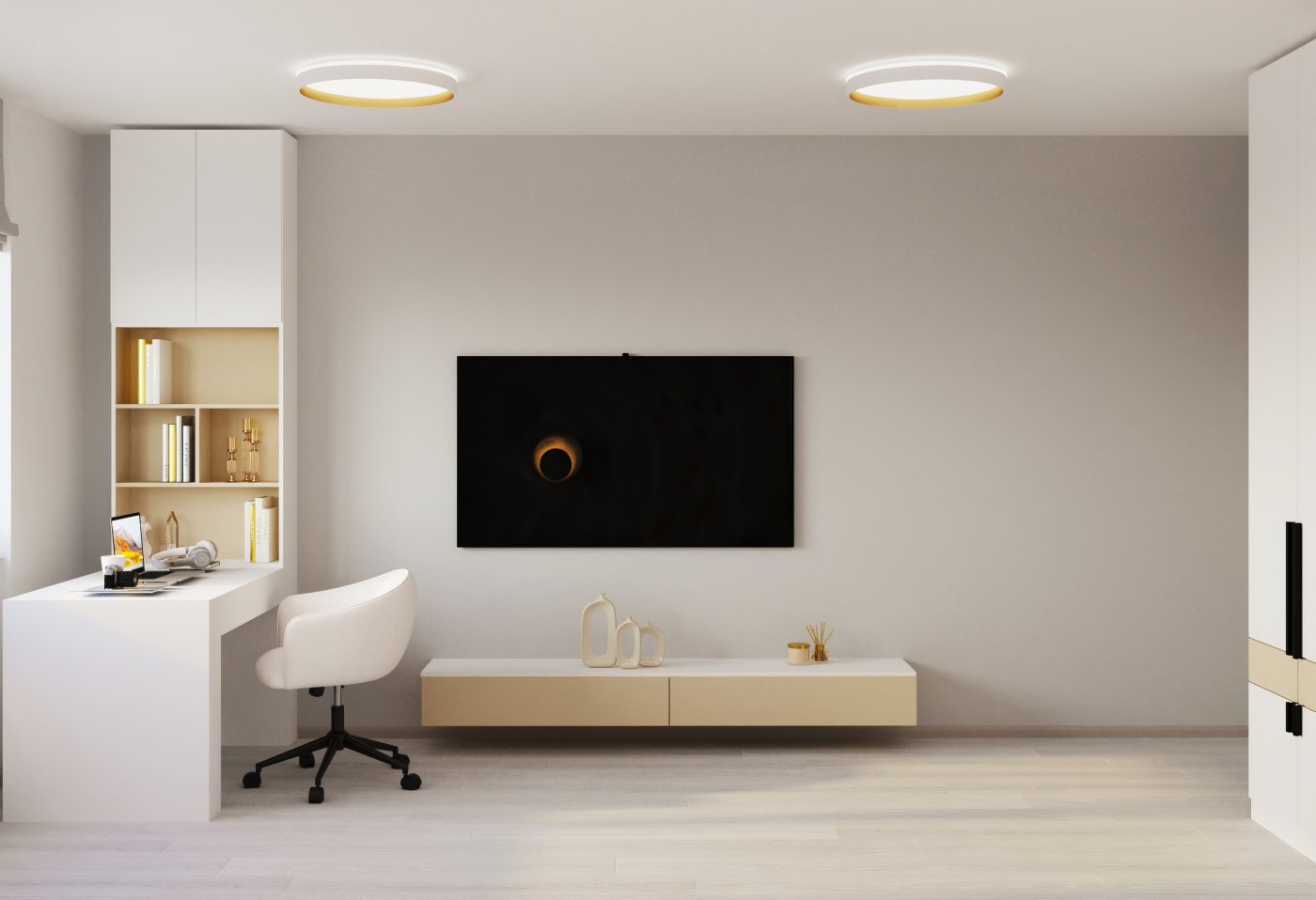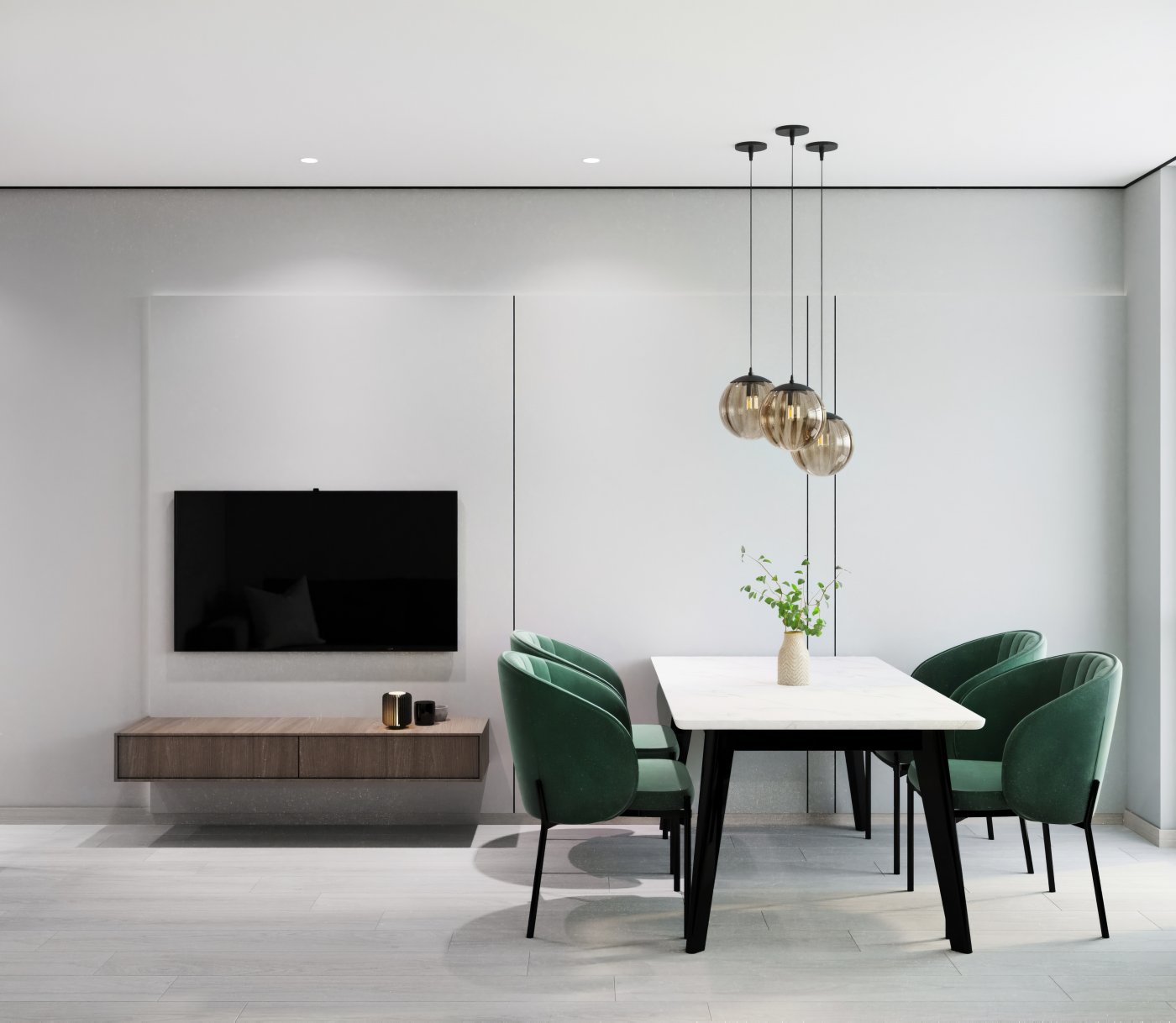Интерьер двухкомнатной квартиры выполнен в современном стиле с использованием светлой палитры и натуральных материалов, что создаёт ощущение простора и уюта. Кухня оснащена встроенной техникой и гармонично объединена с обеденной зоной, обеспечивая комфорт и удобство. Спальня оформлена в минималистичном стиле с продуманными решениями для хранения, что делает пространство максимально функциональным.