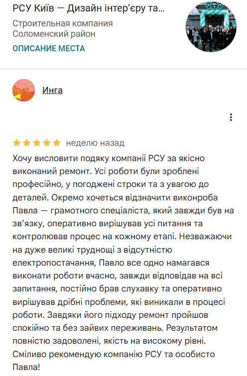 Хочу выразить благодарность компании РСУ за качественно выполненный ремонт. Все работы были проведены профессионально, в согласованные сроки и с вниманием к деталям. Отдельно хочется отметить прораба Павла — грамотного специалиста, который всегда был на связи, оперативно решал все вопросы и контролировал процесс на каждом этапе. Несмотря на большие трудности с отсутствием электроснабжения, Павел всё равно старался выполнить работы вовремя, всегда отвечал на все вопросы, постоянно брал трубку и оперативно решал мелкие проблемы, возникавшие в процессе работы. Благодаря его подходу ремонт прошёл спокойно и без лишних переживаний. Результатом полностью довольны, качество на высоком уровне. Смело рекомендую компанию РСУ и лично Павла!