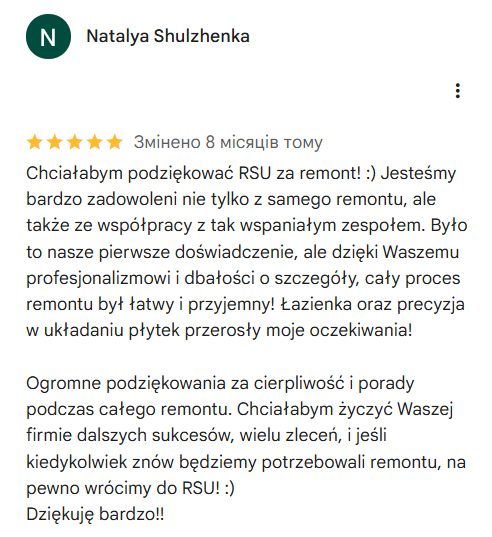 Хотела бы поблагодарить RSU за ремонт! :) Мы очень довольны не только самим ремонтом, но и сотрудничеством с такой замечательной командой. Это был наш первый опыт, но благодаря вашему профессионализму и вниманию к деталям весь процесс ремонта прошел легко и приятно! Ванная комната и аккуратность укладки плитки превзошли мои ожидания!